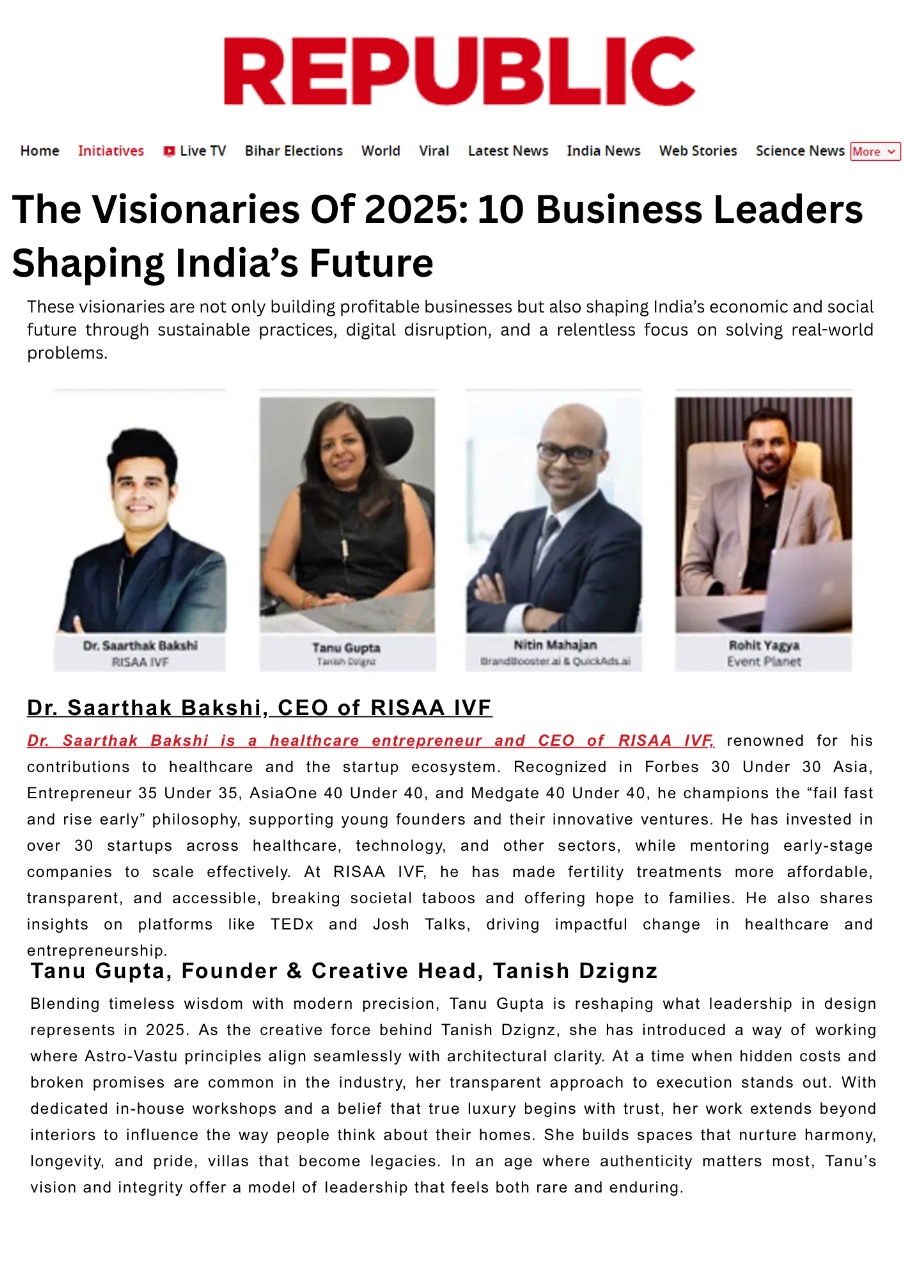 Thrilled to share that Latest LY has featured our journey. Together with Dr. Rita Bakshi, we have built Risaa IVF into one of India’s most trusted fertility care centers, offering advanced and compassionate treatments. Over the years, countless families—including celebrities—have entrusted us with their dreams of parenthood, and it’s been an incredible privilege to guide them on this life-changing journey.