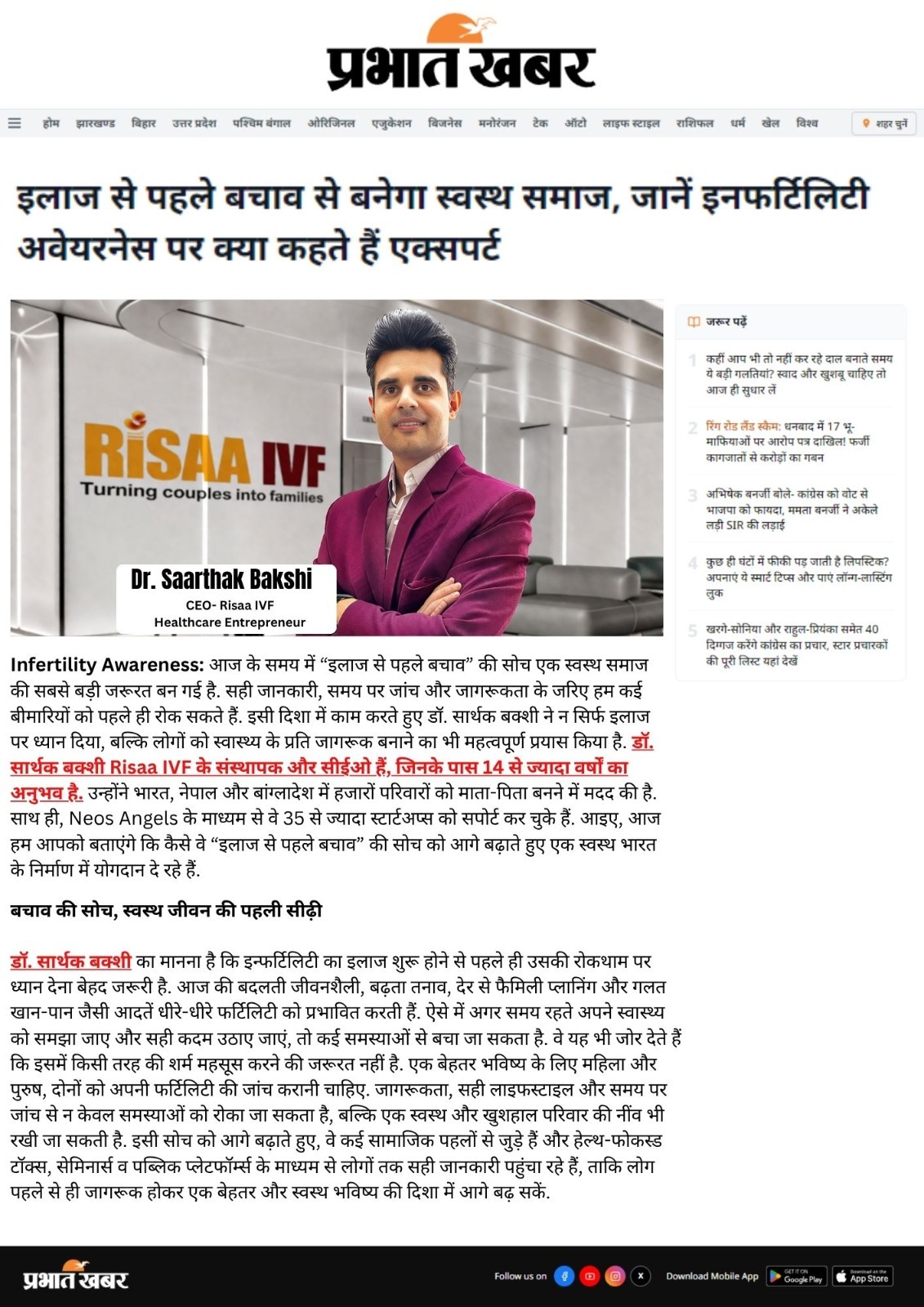 On World Health Day, I’m honored to be featured by Prabhat Khabar on a topic I strongly believe in, that is prevention before treatment. Infertility is not just a medical condition, but a growing concern influenced by lifestyle, stress, and lack of awareness. By focusing on early awareness, timely check-ups, and healthier choices, we can build a healthier and more informed society.
