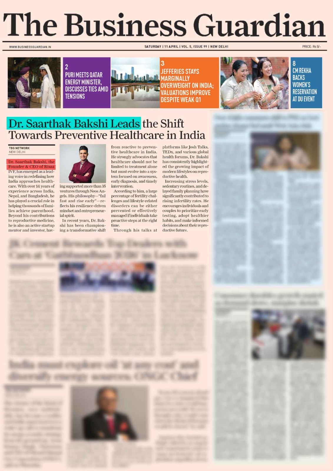 Honored to be featured by 𝐓𝐡𝐞 𝐁𝐮𝐬𝐢𝐧𝐞𝐬𝐬 𝐆𝐮𝐚𝐫𝐝𝐢𝐚𝐧 in their print edition, highlighting my perspective on the shift towards preventive healthcare in India. At Risaa IVF, we have always believed that awareness and early action can make a meaningful difference in people’s lives. Moving from treatment to prevention is not just a healthcare approach—it’s a mindset shift our country truly needs.
