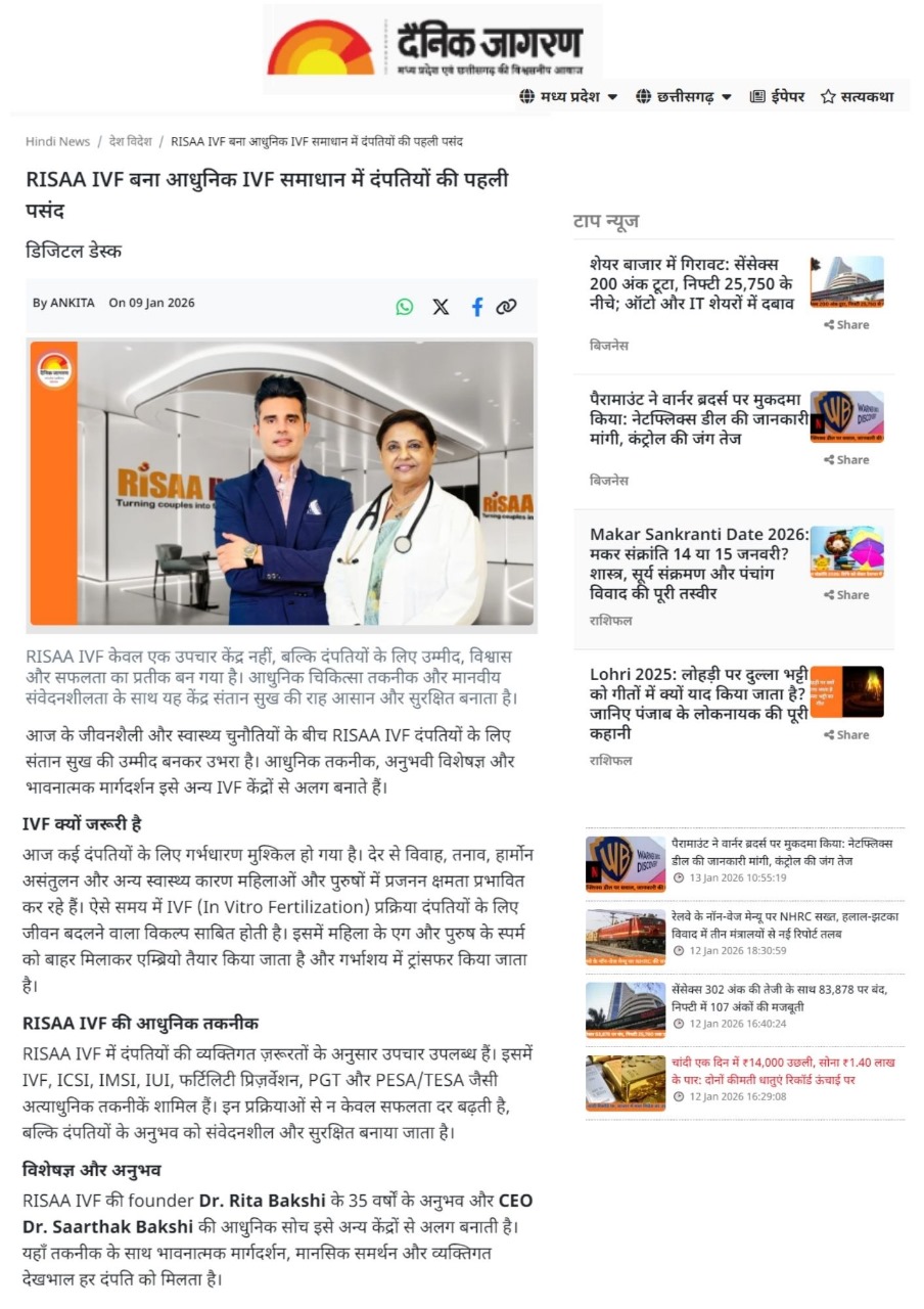 Proud to share that Dainik Jagran Hindi has featured RISAA IVF as a trusted destination for couples seeking modern and ethical IVF solutions. The article highlights Dr. Rita Bakshi’s decades of expertise, my journey in healthcare entrepreneurship, and the growing importance of IVF in supporting couples facing infertility. Grateful for this opportunity to spread awareness, build trust, and help more families make informed fertility choices.